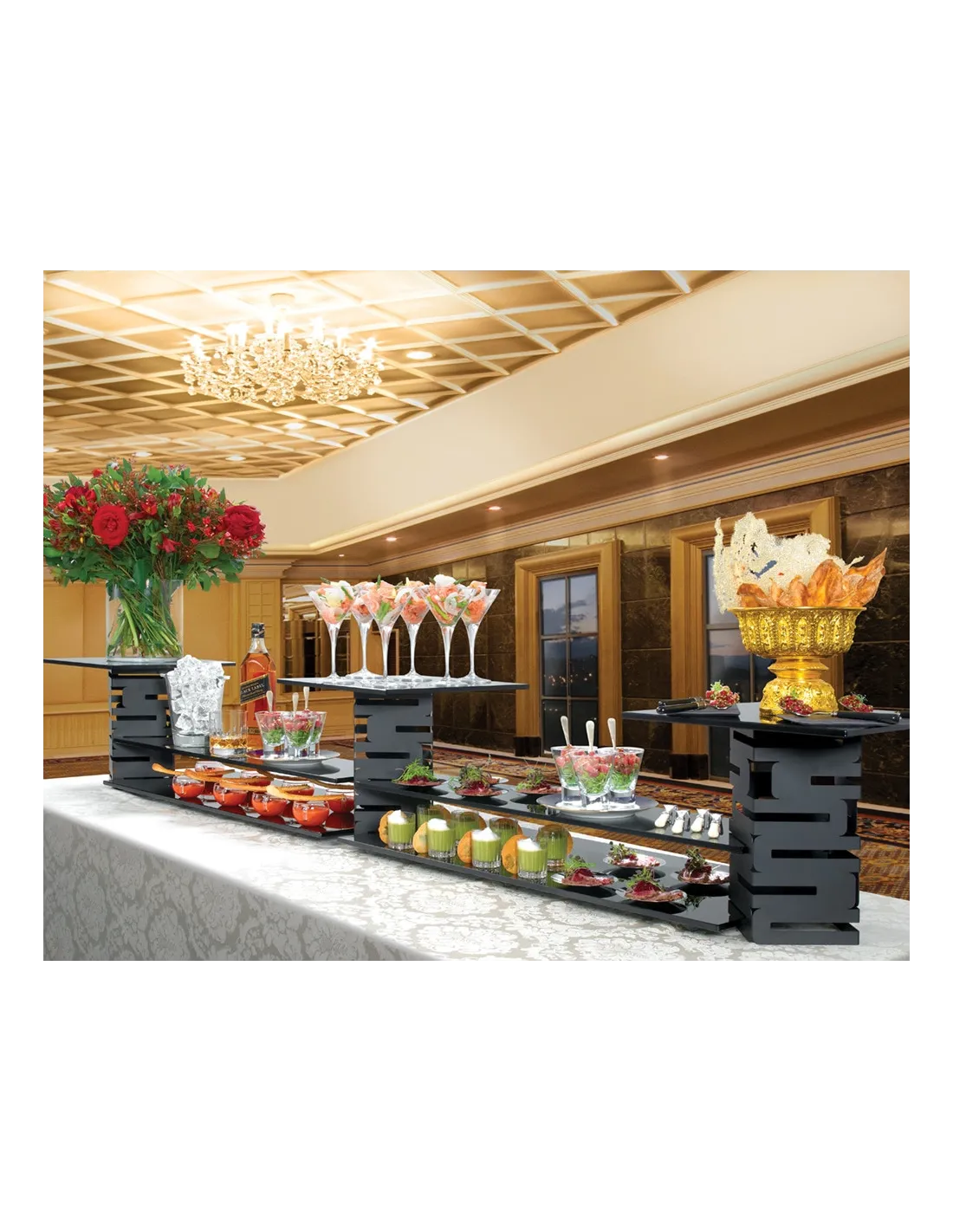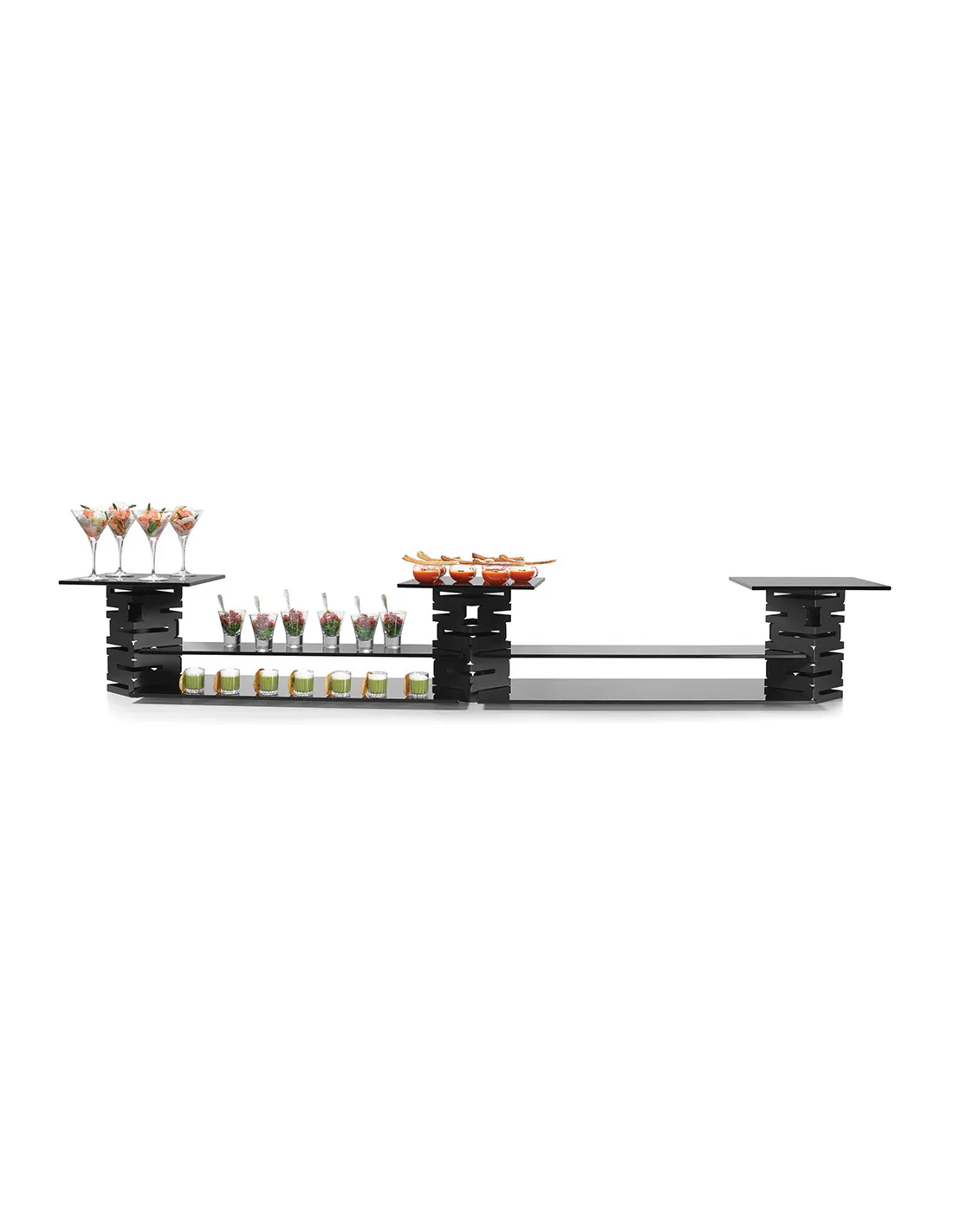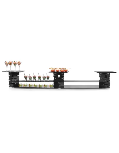 El Kit de Elevadores y Soportes Rosseto incluye 3 risers, 2 bandejas anchas, 2 estrechas y 3 cuadradas en cristal templado negro. Ideal para dar un toque profesional a tu buffet.