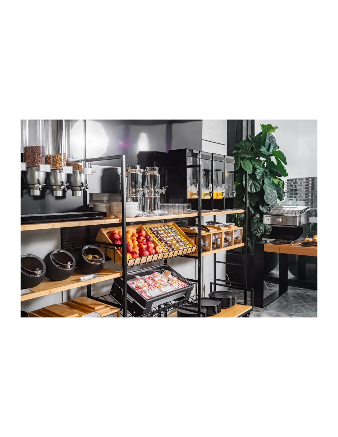 El Carro de Servicio Modulite, con marco negro y estanterías de bambú natural, ofrece resistencia y elegancia para la hostelería. Rosseto.