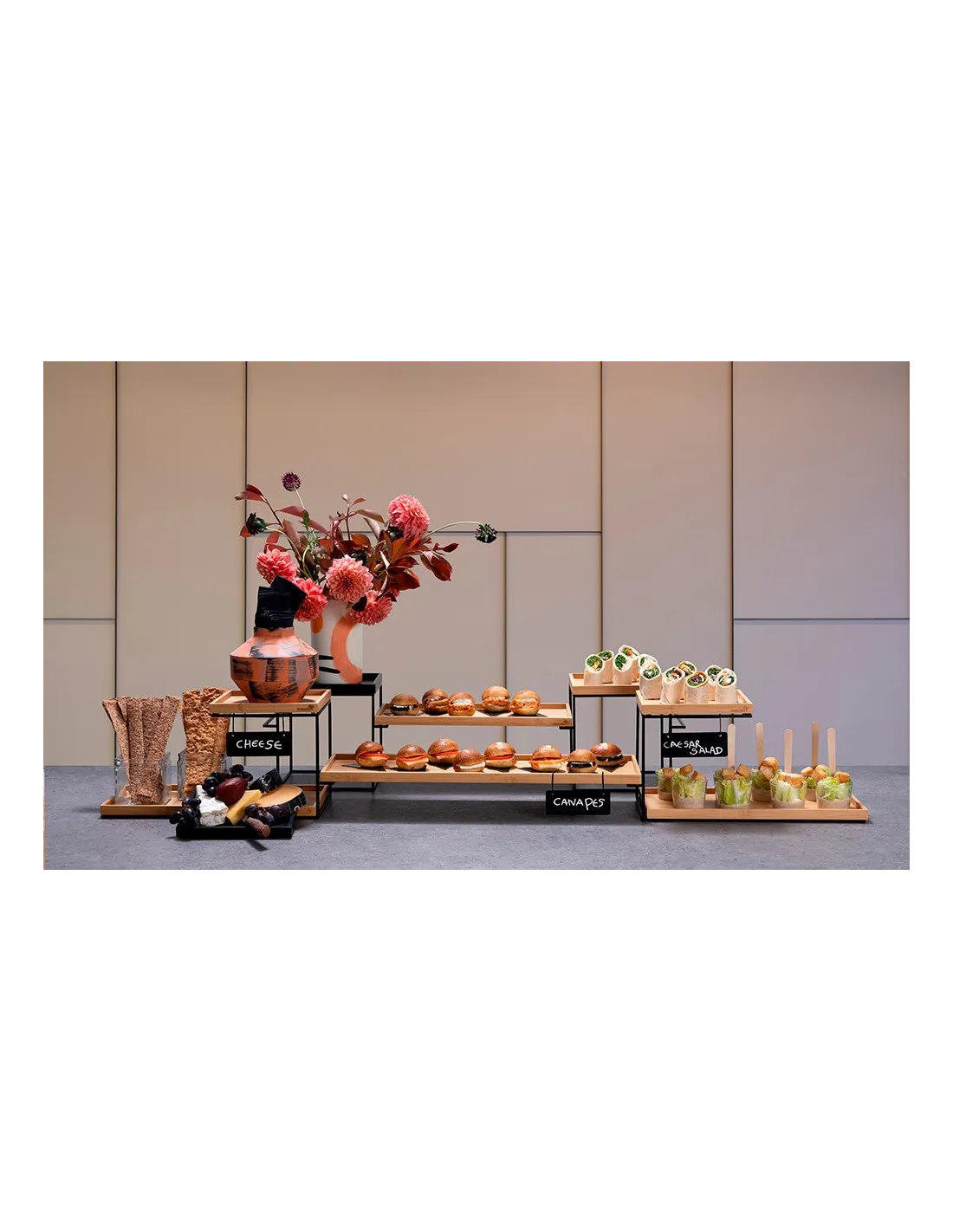 El Elevador Cuádruple de Rosseto en color negro con señal colgante es ideal para destacar tus productos en cualquier establecimiento del sector HORECA.