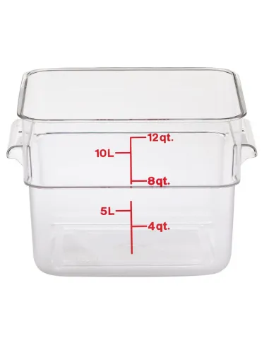 ¿Por qué elegir CAMBRO - 2SFSCW-135 - Recipiente cuadrado 1,9 L - 18,5 x 18,5 x 10 cm - Transparente (Tapa no incluida)? El recipiente cuadrado CAMBRO - 2SFSCW-135 es una solución innovadora para optimizar el espacio en tu negocio de hostelería. Diseñado con materiales de alta calidad, este recipiente transparente no solo ofrece un ahorro significativo en almacenamiento sino que también facilita la gestión del inventario y garantiza una resistencia excepcional frente a temperaturas extremas. Calidad Profesional CAMBRO CAMBRO es sinónimo de calidad y confiabilidad en el sector de equipamiento para hostelería. El recipiente cuadrado 2SFSCW-135 está fabricado en policarbonato, un material que combina resistencia con ligereza, lo cual lo hace ideal para su uso diario en entornos profesionales. Este material es resistente a manchas y olores, asegurando la higiene de los alimentos almacenados. Además, el recipiente soporta temperaturas desde -40 ºC hasta 90 ºC, lo que lo hace apto para congelación y cocción en hornos. Usos Recomendados El recipiente cuadrado CAMBRO es perfecto para una amplia gama de aplicaciones en la hostelería. Su diseño cuadrado permite un almacenamiento eficiente tanto en refrigeradores como en congeladores, optimizando el espacio disponible y facilitando el acceso a los alimentos. También es ideal para preparar y servir alimentos en eventos de catering o cocinas industriales, donde la visibilidad del contenido es crucial. Características Técnicas Ahorro de espacio: El diseño cuadrado permite aprovechar hasta un 33% más de espacio que los recipientes redondos, optimizando el almacenamiento en tu negocio. Transparencia y visibilidad: La transparencia del recipiente facilita la identificación rápida del contenido, mejorando así la gestión del inventario y reduciendo el tiempo de preparación. Normativa/Higiene: El recipiente cumple con los estándares de seguridad alimentaria NSF, garantizando su uso seguro en entornos profesionales. Además, es apto para lavavajillas y resiste manchas y olores.